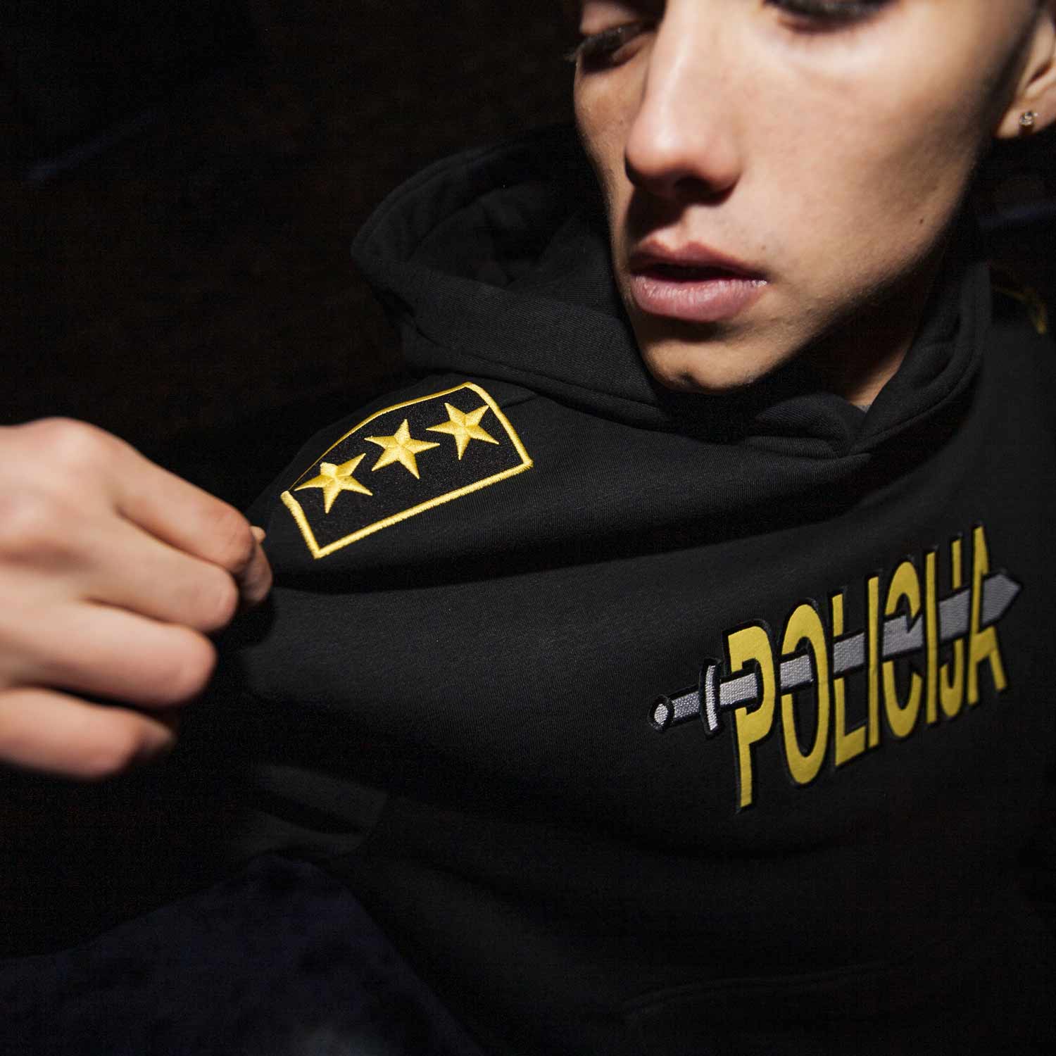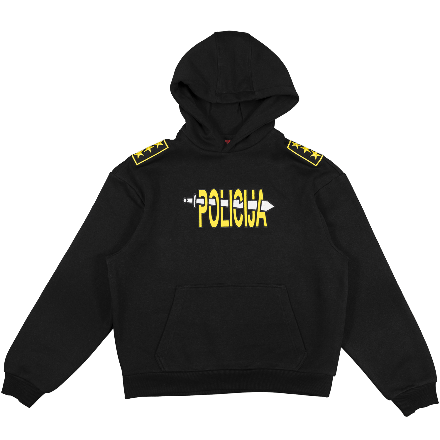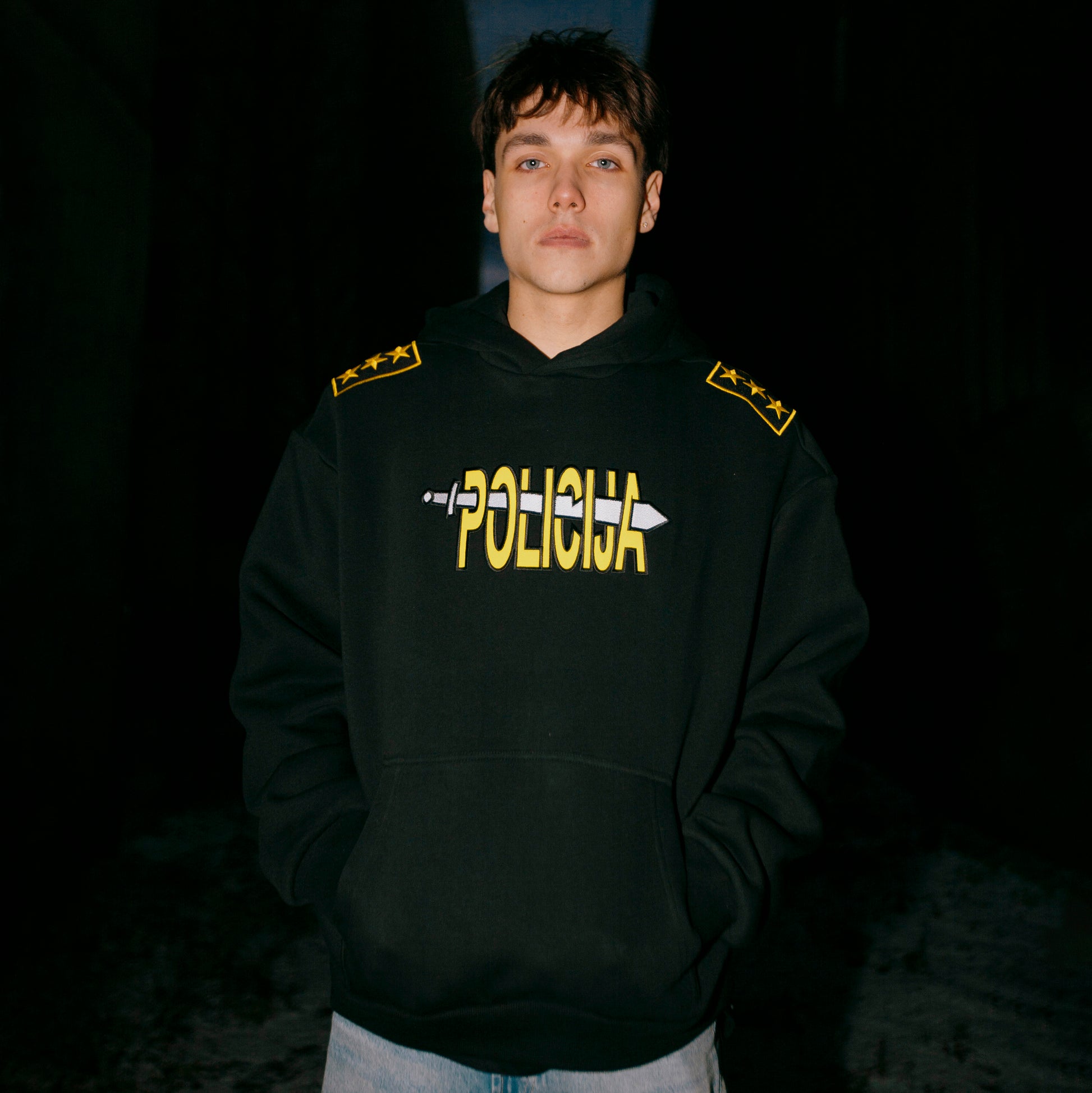 This is the Lemon Party hoodie. Made from 70% cotton and 30% polyester. The graphic contains sword from the old Latvian police logo. The epaulettes signifies your rank on the streets of Riga.
