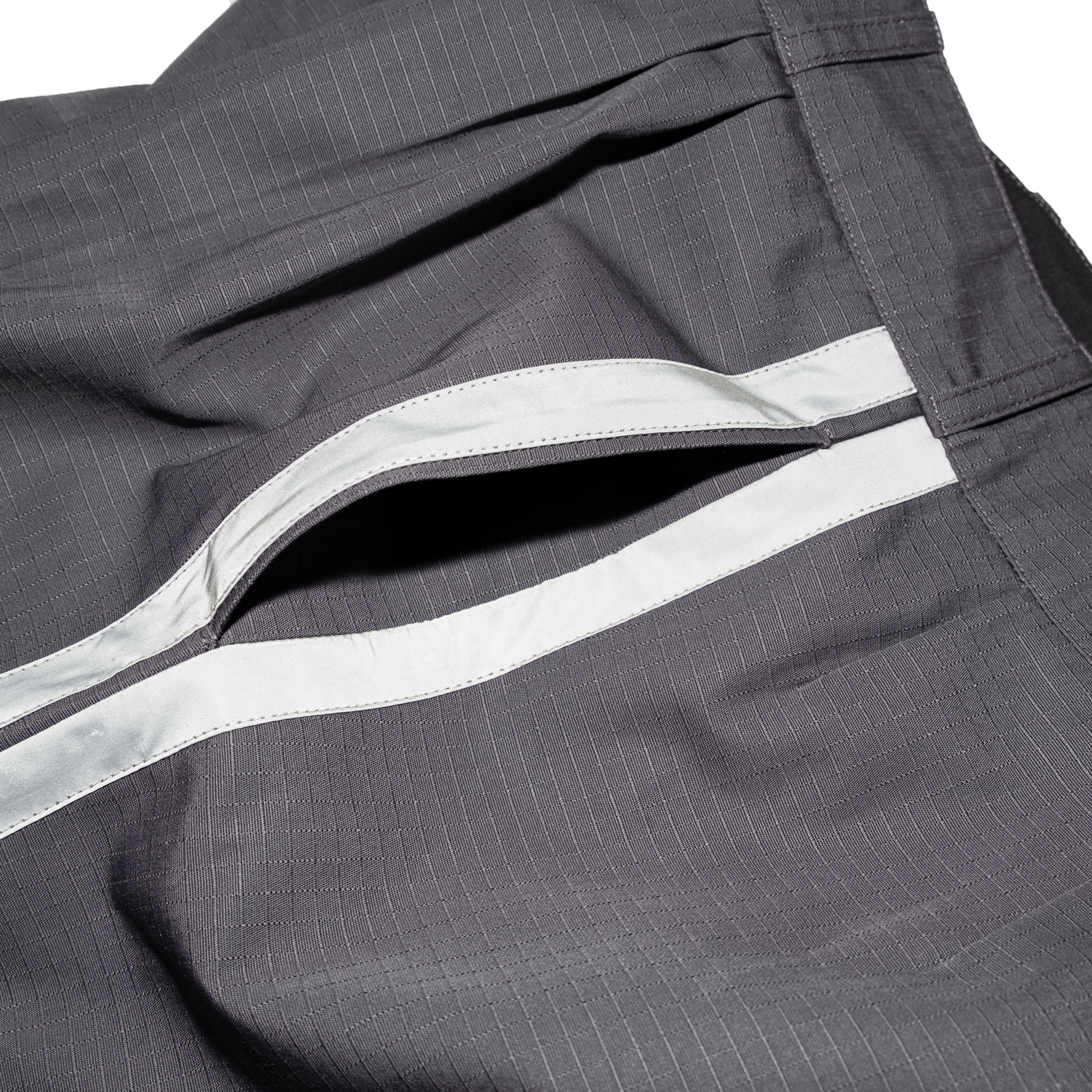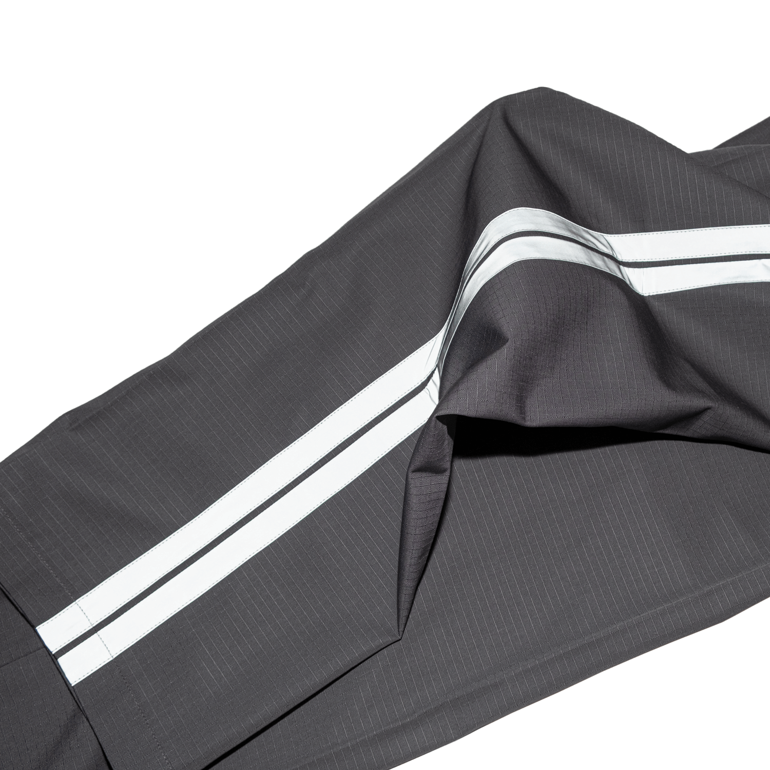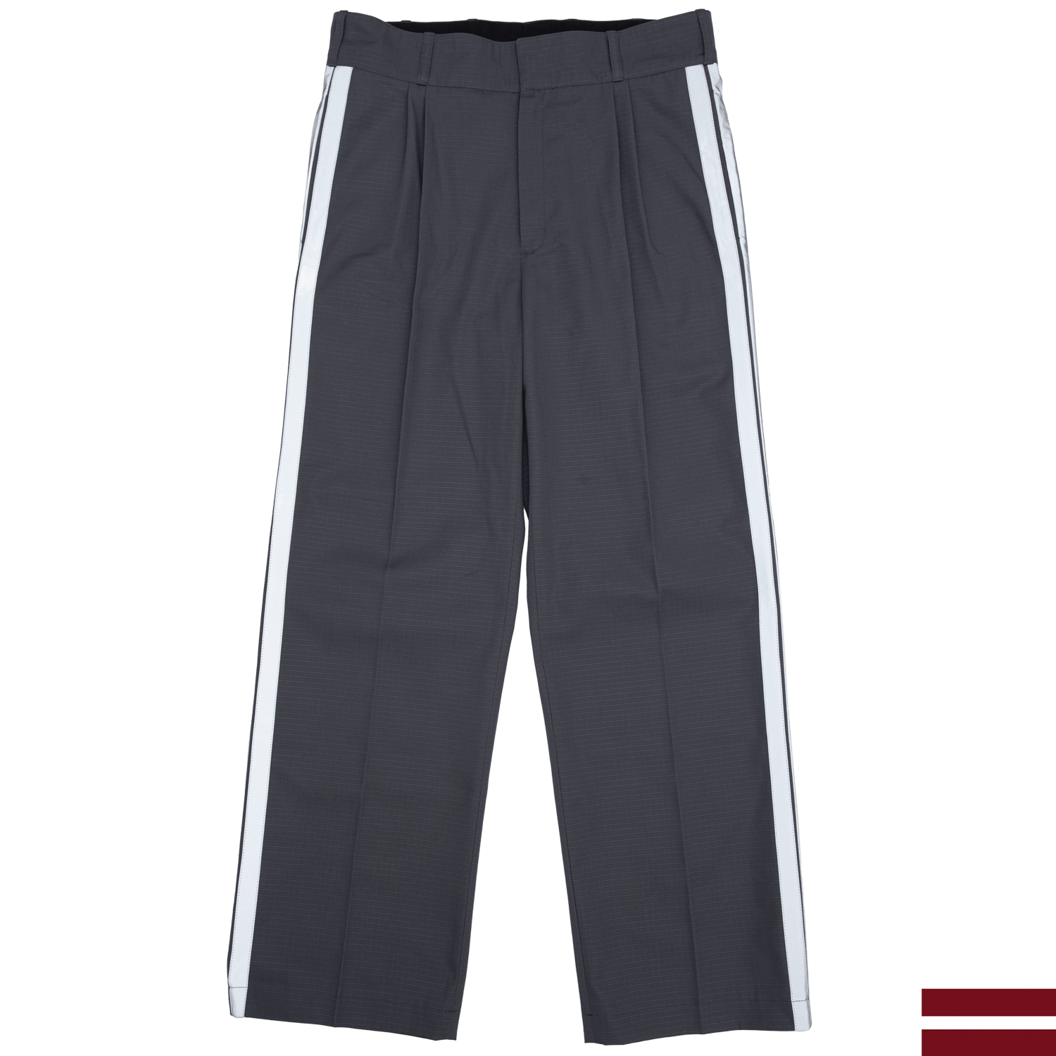 These are the Highway Pants. They are handmade in the same atelier in Riga where old Latvian police uniforms were produced, constructed from 48% cotton and 52% polyester ripstop. The design is a modified version of police parade uniform pants, cut from the fabric used for Latvian prison guard uniforms. The reflective lampasses will protect you from the dark forces of Riga.
